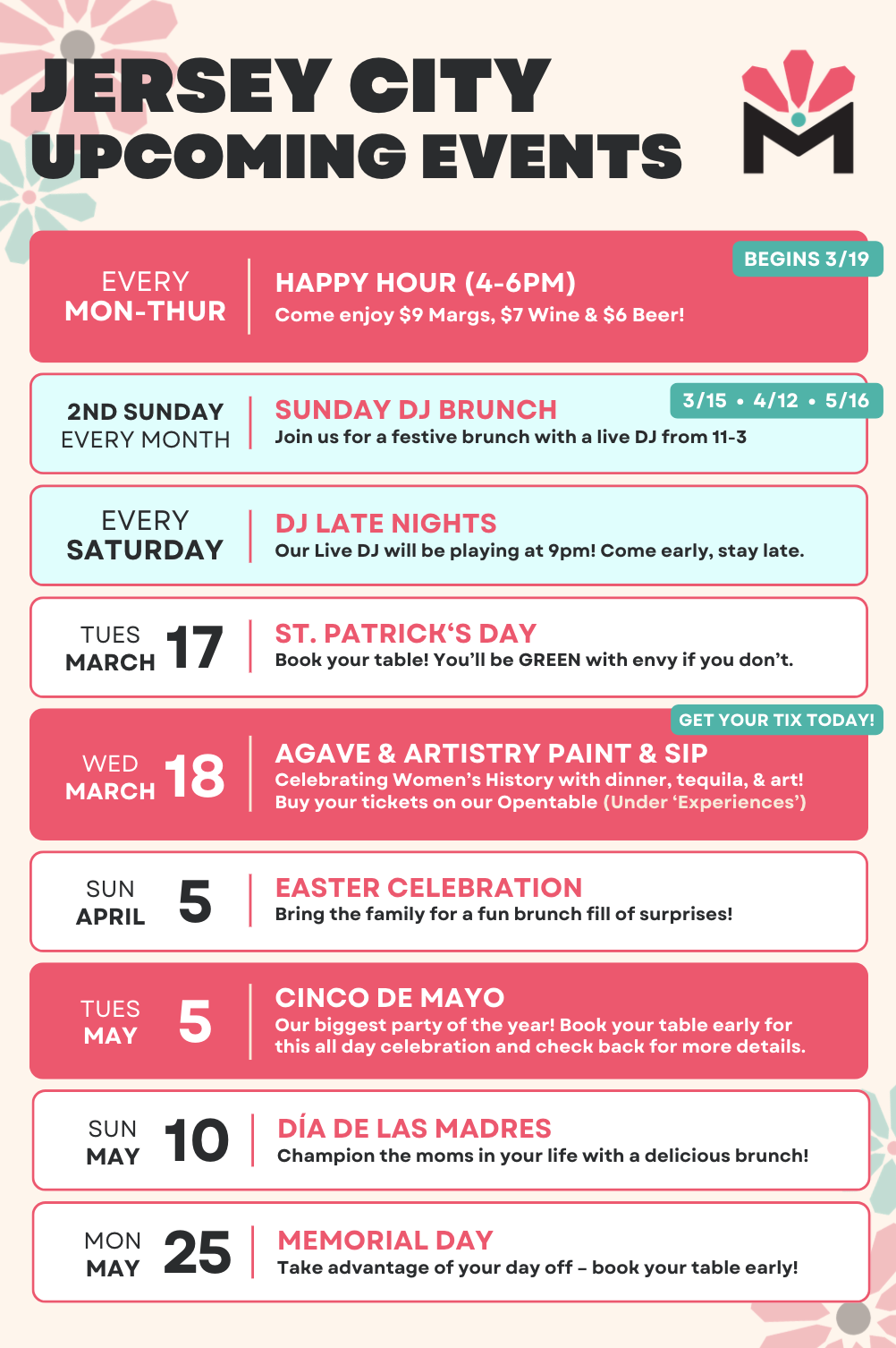 We're bringing New Jersey is a little more happiness, one margarita at a time. Join us at our bar for our Happy Hour specials, including $9 Margaritas, $7 Wine, and $6 Beer! Plus, be sure to keep your eyes peeled in early April – we might be bringing you a food menu to compliment those Happy Hour drinks 😉