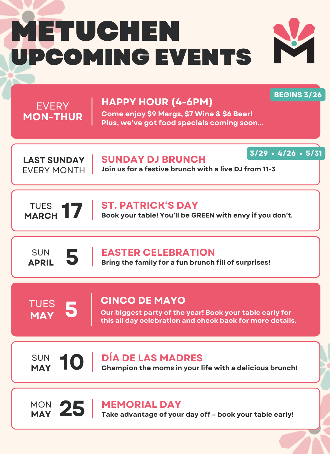 METUCHEN: Begins March 26th